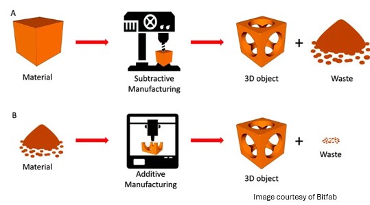 “Additive manufacturing is the process of creating an object by building it one layer at a time. It is the opposite of subtractive manufacturing, in which an object is created by cutting away at a solid block of material until the final product is complete.